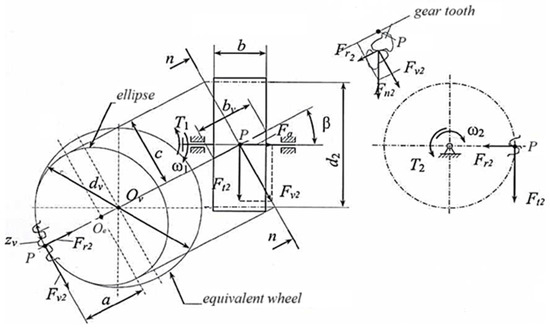 Helical gears are calculated using the formulas of equivalent spur gears with the introduction of correction factors [4,5,6,7]. Similarly, to the calculation of spur gears, the bending stresses in the teeth of helical gears can be calculated by the formula