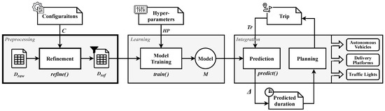 Travel time prediction involves a sequential workflow, as illustrated in Figure 1. This workflow is divided into three primary processes as follows: preprocessing, learning, and integration.