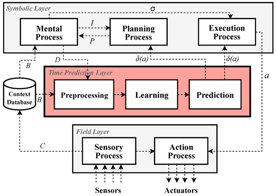 Within the E-HoA architecture, the symbolic layer plays a crucial role by managing weights to facilitate concurrently scheduling intention behaviors. The heart of this layer is the Mental process, which revolves around the concepts of Beliefs (B), Desires (D), and Intentions (I) [32]. The Mental process is focused on optimizing the agent’s intentions by engaging the Planning process to determine the best execution plan (, a sequence of actions a) derived from the weighted intentions (I). The Planning process calculates the optimal execution plan (P) by considering the specific action duration () within a given spatiotemporal context. Once the optimal plan is computed, the Mental process instructs the Execution process to perform the actions defined by the plan in sequence ().