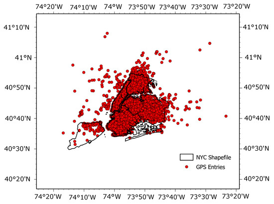 To mitigate the impact of GPS outliers, we employed the “Select by Location” tool in ArcGIS Pro, which enabled the selection of GPS entries that fell within the geographical bounds of the New York City (NYC) shapefile, ensuring that only valid and geographically relevant GPS data were included in our dataset. Figure 4 illustrates a sample of GPS data collected in February 2014, plotted alongside the NYC shapefile, demonstrating the distribution of the selected GPS entries within the city.