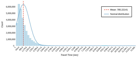 As illustrated in Figure 5, the travel time data follow a truncated normal distribution, with a lower bound of 1 s and an upper bound of 11,995 s. These extreme values are atypical for taxi trips within NYC and are classified as outliers. The distribution exhibits a left-skewed pattern, with a mean travel time of 785 s. The presence of a long right tail further indicates the existence of outliers, which, if not addressed, could significantly skew the analysis and interpretation of the data. The proper handling of these outliers is essential in ensuring the robustness and accuracy of subsequent modeling efforts.