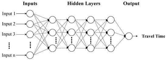 In recent years, Machine Learning (ML) has emerged as a powerful tool for advancing transportation planning and operations. A comprehensive review by Abdi et al. [4] found that 64% of the 75 surveyed studies on travel time prediction utilized ML methods, particularly Artificial Neural Networks (ANNs). ANNs, a subset of ML algorithms inspired by the human brain’s architecture [5], have demonstrated exceptional capabilities in modeling complex transportation systems, especially in urban areas with highly dynamic and heterogeneous traffic conditions [6,7,8,9,10,11]. Their ability to process vast datasets and learn intricate patterns makes them particularly suited for travel time prediction.