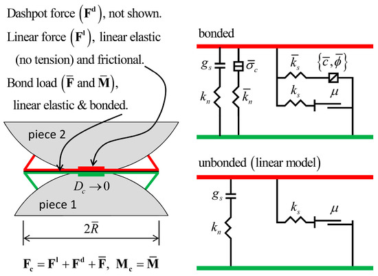 where is the linear contact force, is the damping force, is the parallel bond force, and is the parallel bond moment.