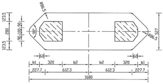 The project of the Heihe–Blagoveshchensk Amur River Bridge started from Changfatun, Heihe City, Heilongjiang Province, and is located in Kanykurgan Village, Blagoveshchensk City, Russia. As the first steel–concrete combination girder low-tower cable-stayed bridge built in a high-latitude, cold region, the Heihe–Blagoveshchensk Amur River Bridge faces severe ice conditions every spring during the ice flow period. The China–Russia Heilongjiang Bridge piers use a solid pier cross-section for the flat hexagonal, a pier width of 16.8 m, a pier thickness of 5.27 m, and the pier to meet the ice for the tip of the typical tip-type ice-breaking prisms, with an angle of about 90°. The Heihe–Blagoveshchensk Amur River Bridge pier cross-section is shown in Figure 2.