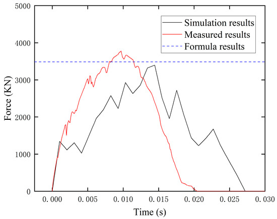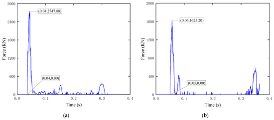 As shown in Figure 3, the maximum force obtained from the numerical simulation of the DEM of the impact particles of the flow ice and the bridge abutment is 3756.98 KN, which is 9.8% different from the measured maximum flow ice load of the Heihe–Blagoveshchensk Amur River Bridge in 2021 3388.8 KN, and 7.7% different from the ice pressure calculation method of 3485.93 KN stipulated in the Chinese General Specification for Design of Highway Bridges and Culverts (JTG D60-2015). The results show that the discrete element simulation value is more consistent with the measured value, which verifies the rationality of the DEM. The shorter duration of the single impact response of the simulation results compared to the measured values may be due to the fact that the actual ice is not uniformly distributed and material continuity is difficult to ensure, while the simulation method adopts the assumption of a homogeneous ice body, which accelerates the fracture response. In addition, the continuous impact of ice rows in the field produces a dynamic superposition effect, which enlarges the variability of the time–course characteristics. The above results show that the discrete element method can effectively simulate the transient impact process of ice loading.