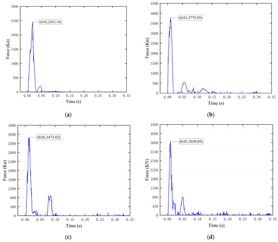 Time course of ice force at different ice speeds: (a) 0.5 m/s; (b) 1 m/s; (c) 2 m/s; (d) 2.5 m/s.
