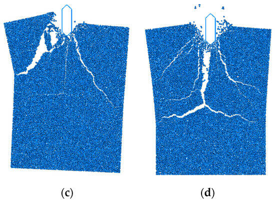 According to the ice row damage phenomenon under different porosities in Figure 10, it can be found that the damage pattern of the ice row changes with the increase in porosity. The damage is gradually concentrated near the face in contact with the ice-breaking column, and at high porosity, the abutment mainly has a destructive effect on the ice rows in the contact region, while it has less effect on the ice rows away from the contact region.