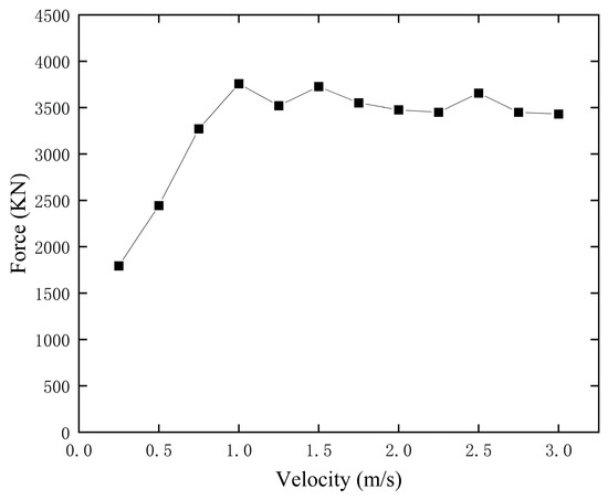 Figure 6 shows the maximum ice force applied to the bridge abutment at different ice velocities. As shown in the figure, the extreme value of the ice load increases significantly with the increase in velocity, and the ice load reaches the maximum value when the river ice velocity is 1 m/s. As the velocity continues to increase, the ice load’s extreme value eventually remains stable.