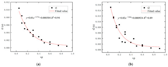 Figure 13. Load time, unload time vs. vp: (a) load time fitting results; (b) unload time fitting results.