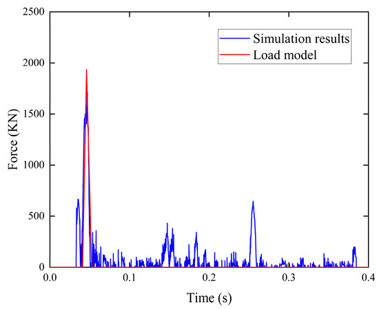 The dynamic load model of the river ice impacting on the bridge pier can be obtained by substituting the above parameter analysis results (17)–(21) into Equation (13). By comparing the discrete element simulation results of river ice with a porosity of 0.08, ice thickness of 0.5 m, ice speed of 2.5 m/s with the results of the load model, it can be found that the ice force time course calculated according to the two methods is relatively close to that shown in Figure 14. The comparison results of each parameter are shown in Table 4, in which the comparisons between the simulation results and the load model calculation results in each key parameter are listed in detail, and all of them show good consistency. It is evident that the river ice dynamic load model established in this paper more accurately simulates the process of the impact of the flow of ice on the bridge abutment of the Heilongjiang Bridge. In practical application, the method of this paper can be referred to, according to the specific bridge project, the ice load model used for further correction and improvement.