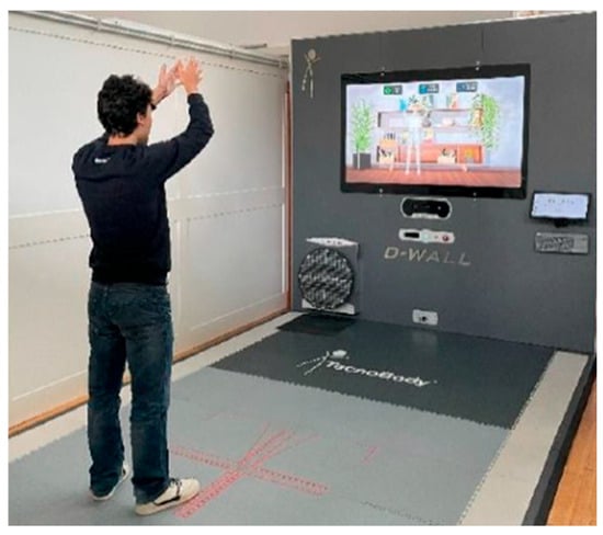 In the third phase, exergaming was conducted with the D-Wall® system (Figure 3). The D-Wall® system has a 3D infrared camera that captures movements in real time. The goal was to improve forward-pass load movements according to the real-time feedback of the shift of the center of pressure (CoP) recorded by the force platform. “Shelf” and “Library” exergaming required the participants to move objects in different positions by using either one or two hands.