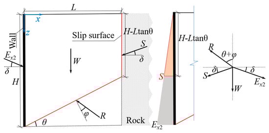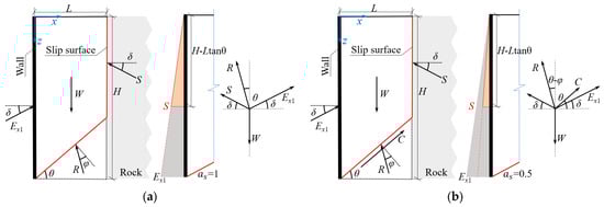 In cohesionless soil, there is no bonding between soil particles, the soil and rock (or structure) remain in contact under the active state. Hu et al. [38] postulated that the earth pressure on both sides above the slip surface inflection point was equal, i.e., the reaction coefficient = 1. This conclusion is supported by the model test results of Chen et al. [40], and the force analysis for this case is presented in Figure 1a. When the backfill consists of clay, partial separation occurs between the soil and rock (or structure) under the active limit state due to cohesive bonds between soil particles. Consequently, this paper assumes that the earth pressure on the rock (or structure) above the slip surface inflection point is half of that on the left retaining wall, i.e., = 0.5, with the corresponding stress analysis presented in Figure 1b. To simplify the calculation, the earth pressure is assumed to be triangularly distributed. The counterforce of the rock on the slip wedge is denoted as . The expressions of W, and of the slip wedge are as follows: