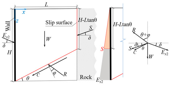 There are slight differences in the forces acting on the slip wedge between the passive and active states. In the passive state, where the wedge undergoes rightward movement, the rock (or structure) maintains intimate contact and interacts with the slip wedge. Consequently, the earth pressures at the same depth above the slip surface inflection point are postulated to be equal on both sides of the wedge. For computational simplification, the earth pressure is considered to follow a triangular distribution. Furthermore, the cohesion () is uniformly distributed on the slip surface. The corresponding mechanical model of the slip wedge under these conditions is shown in Figure 2.