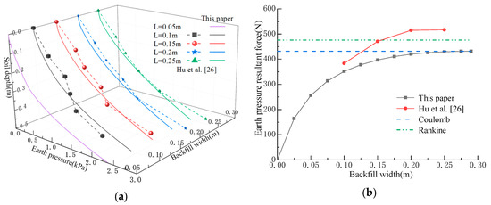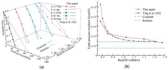(a) Relationship between the width of the soil behind the wall and ; (b) Distribution of earth pressure at various widths.