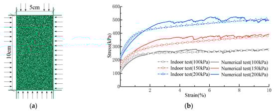 Numerical biaxial tests are employed to calibrate the indoor triaxial test results. The test specimen dimensions are 5 cm in width and 10 cm in height. The particle sizes were selected based on the research of Ding et al. [46]. The test is conducted under confining pressures of 100 kPa, 150 kPa, and 200 kPa. The generated model is shown in Figure 6a.