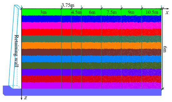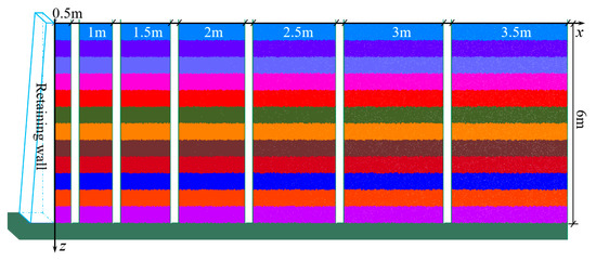 To investigate the effect of the backfill width () on the active limit earth pressure, the soil height () behind the model wall is taken to be 6 m. According to Equation (10), the maximum width () satisfying the finite soil conditions is 3.92 m. Therefore, the backfill width is varied as follows: 0.5 m, 1 m, 1.5 m, 2 m, 2.5 m, 3 m, and 3.5 m for this study. Particles are generated using the stratified rainfall method. The particle radius needs to be increased to simplify computations due to the relatively large model size compared to the particle radius. Previous studies [46,47] have demonstrated that the influence of particle size becomes negligible when the ratio of the shortest side of the model to the maximum particle radius () exceeds 100. Consequently, in this study, the particle size increased by a factor of 5 to 15, depending on the backfill width behind the wall. The convergence of the calculation results is evaluated based on the ratio of the average unbalanced force to the average contact force (referred to as the ratio-average). The models generated for each width are illustrated in Figure 7.