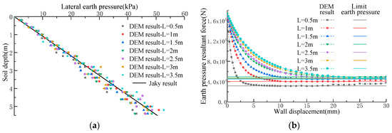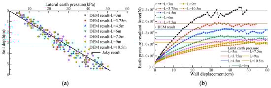 The left wall of the model was displaced at a rate of 1 mm/s while the right wall remained stationary. The numerically calculated time steps ranged between 10−5 and 10−6 s. The earth pressure behind the wall was determined using measurement circles with a radius of 0.1 m and center spacing of 0.2 m. The measured results were then compared with the results from the Jaky formula [48], as shown in Figure 8a. The distribution of the static earth pressure under various backfill widths shows good agreement with the Jaky formula, confirming the rationality of the initial state simulation. Data were recorded at 0.5 mm intervals until the wall displacement reached 10 mm, after which recording intervals were extended to 1 mm. The active limit earth pressure in this paper was determined as the average of five data points, two preceding the minimum value and two subsequent to it. The relationship between the earth pressure resultant force and the wall displacement for each backfill width is shown in Figure 8b.