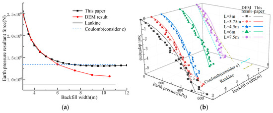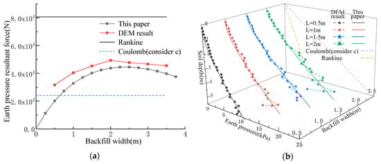 To validate the method proposed in this paper, the DEM results are compared with the results of this paper, as illustrated in Figure 9a. The Pearson correlation coefficient between the two sets of results was 0.993, showing a consistent trend. The error between the two datasets decreases non-linearly as backfill width increases, ranging from a maximum of 36.2% to a minimum of 6.8%. When the backfill width behind the wall () is zero, the resultant active earth pressure force () is also zero. As increases, follows a pattern of initially increasing and then decreasing, gradually approaching the Coulomb theory considering cohesion. When = (critical width), the triangular slip wedge assumed in Coulomb theory represents a special case of the trapezoidal slip wedge. The trapezoidal slip wedge assumed in this article fails prior to the triangular slip wedge. In this case, the Coulomb result is not the maximum value of the function due to the influence of cohesion. The depth-dependent distributions of active earth pressure under various width conditions are shown in Figure 9b. As the soil modulus exhibits a nonlinear increasing trend with burial depth, under identical soil deformation conditions, the burial depth shows proportional increases in earth pressure. The consistent variation trends between both components demonstrate the validity of the proposed methodology.