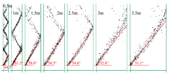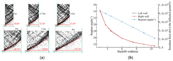 During wall displacement, pre-existing interparticle contacts may be disrupted. The formation of new contacts occurs when sufficient relative displacement develops between particles. Regions exhibiting concentrated new contacts can be considered as the location of the slip surface. The slip surface distribution and rupture angle obtained in this study under various backfill widths are shown in Figure 10.