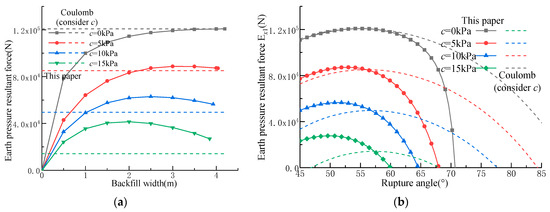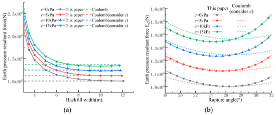- For a given backfill width, the cohesion is inversely proportional to the resultant active limit earth pressure force and directly proportional to the resultant passive limit earth pressure force . As the internal friction angle increases, decreases nonlinearly, while experiences a significant growth. Furthermore, variations in the wall-soil friction angle have a relatively minor influence on , whereas grows exponentially with increasing .