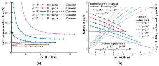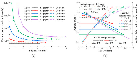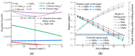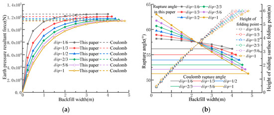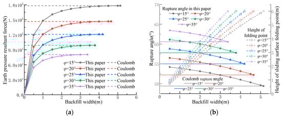 The slip surface under the passive state for various widths is depicted in Figure 14a. As the backfill width increases, the angle between the slip surface and the horizontal plane decreases linearly, and the slip surface inflection point gradually approaches the ground surface. A comparison of the earth pressure resultant forces on both sides of the slip wedge above the slip surface inflection point is shown in Figure 14b. The magnitudes of both forces are essentially identical, which validates the rationality of the assumptions proposed in this paper.