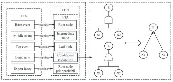 Fault trees can be converted into Bayesian networks for quantitative analysis, providing advantages for system probability updating, as well as prediction and diagnostic calculations [34]. In a Bayesian network, all events and logic gates from the fault tree are converted into random variables, and the interactions between the variables are represented by oriented arrows. This conversion process from an FTA model to an FBN model is shown in Figure 2.