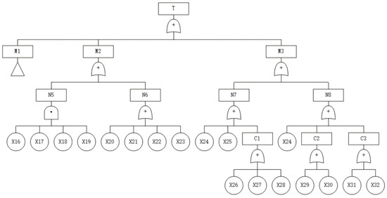 Based on the risk factors associated with ethane storage tank leakage, the logical relationships among these risk factors were systematically sorted out. Using X1, X2, …, X32 as the basic events, A, B, and C as intermediate events, and the ethane storage tank leakage risk T as the top event, we established a fault tree for ethane storage tank leakage risk, as shown in Figure 5.