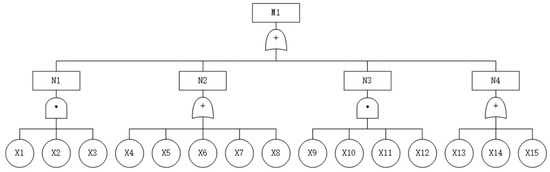 Let represent the likelihood of the T event occurring, denote the likelihood of the rth basic event, and represent the status of the basic event (1 for occurring, 0 for not occurring). The calculation of is as follows: