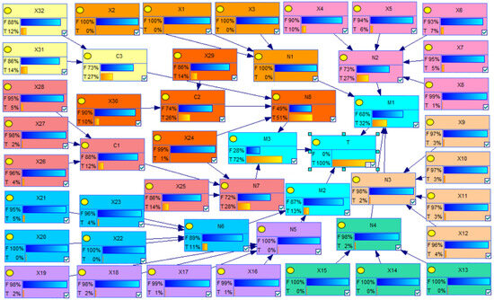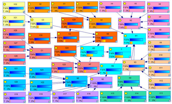 Therefore, the likelihood of the T event occurring is computed as = 0.519. Additionally, after following the above process to determine the occurrence probabilities for all nodes, a Bayesian network risk diagram is generated, as illustrated in Figure 6.