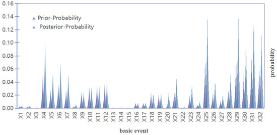 As indicated in Figure 8, when the risk of ethane storage tank leakage occurs, the probabilities of certain basic events show significant changes compared with those derived from forward inference. Notably, high-risk factors such as X4, X25, X29, X31, and X32 exhibit the most pronounced shifts. Therefore, in the practical storage process of ethane storage tanks, it is crucial to ensure the safety and rationality of the systems corresponding to these risk factors to avert potential security risks.