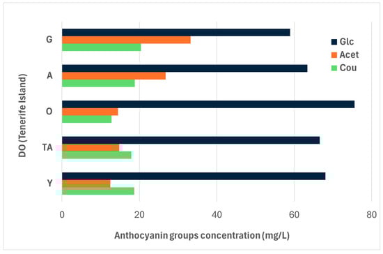 Figure 1 shows details about the main anthocyanin groups, categorized by their chemical structure and DO. The mean Glc concentrations were higher in red wines from DO O, DO TA, and DO Y compared to those from the south of the island of Tenerife, DO G, and DO A. Significant differences were only observed between DO O and southern Tenerife DOs (G and A). Interestingly, the mean Acet concentrations show the opposite trend, with significantly higher values in DO A and DO G compared to all the northern Tenerife DOs (O, TA, and Y). Regarding Cou concentrations, the values are similar across most DOs, except for DO G, which shows significant differences compared to DO O.