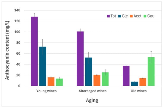 The significant decrease in the mean concentrations of Tot and Glc with aging is consistent with anthocyanin degradation and polymerization over time [36]. In particular, the sharp decline observed in red wines aged more than 3 years suggests that the anthocyanins are progressively transformed into more complex polymeric pigments, which contribute to the colour stability of aged wines [25]. In contrast to the glucosides, the mean concentrations of Cou significantly increase with aging, supporting the assumption that these compounds are more stable during the maturation process and can be formed over time through reactions involving acylation [37]. Acetylated derivatives do not exhibit a clear trend with aging, suggesting that these compounds are less affected by the aging process compared to glucosides and coumaroyl derivatives. This variability might be due to their stability in the wine matrix components. In any case, the transformations observed lead to a loss of the bright red colour associated with young wines, resulting in the more brick-red hues typical of older wines.