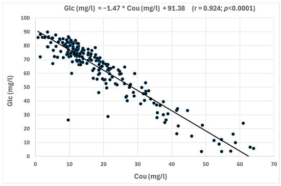 All the correlations were positive, except those including the total coumaroyl derivatives. In fact, most of anthocyanin glucosides demonstrated strong positive correlations between them, indicating that these compounds tend to increase their concentrations together. D-3-glc, Pe-3-glc, and M-3-glc showed highly significant correlations, with r > 0.88 for the three correlations. Moderate correlations (r = 0.64–0.67) with a lower significance were found between these three glucosides and Pe-3-glc, while weak correlations were found with C-3-glc. Figure 3 shows the highly significant correlation between D-3-glc and Pe-3-glc, which are non-major anthocyanin compounds. In this Figure, it can be observed how the cloud points representing the red wines are aligned, defining the equation from the corresponding regression line indicated in the Figure. In contrast, significant inverse correlations were observed between Glc and Cou compounds with individual and calculated anthocyanins. Between them, it could be emphasized the inverse correlation between Cou and Glc concentrations due to its high significance (r = −0.924) (Figure 4). In addition, D-3-glc (r = −0.393, p < 0.001), Pt-3-glc (r = −0.454, p < 0.001), Pe-3-glc (r = −0.386, p < 0.001), and M-3-glc (r = −0.485, p < 0.001) showed inverse relationships with Cou, indicating that when the concentration of these non-acylated anthocyanins increases, the concentration of Cou decreases.