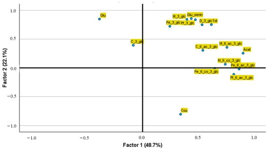 Factor 2, which explains 22.1% of the variance, differentiates anthocyanins along a different axis, more related to specific environmental and aging influences. For instance, Glc is positioned prominently at the top of the axis, while Cou is situated in the bottom-left quadrant, far from the anthocyanin cluster. This position highlights its independence from most compounds, possibly reflecting that its synthesis is mediated by hydroxycinnamic acid present in red wines [39].