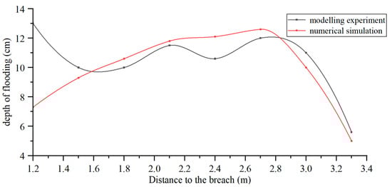 The results of the straight shear experiments are shown in Figure 5, which shows that the strength index of the original sample of tailings was 9.1KPa for cohesion, and the internal friction angle was 26°. The complete flow and accumulation process of the tailing sand flow was observed during the experiment, and the comparison of the numerical and experimental results was based on the flow velocity, accumulation location, and thickness. When taking the Coulomb base friction coefficient of 0.43, the Manning friction coefficient of 0.15, viscous cohesion of 9.1 KPa, and pore pressure coefficient of 0, the model experiment was the closest to the results of the numerical simulation as illustrated in Figure 6, and the experimental results of the final channel accumulation thickness were taken to show the results of the experiments. There was agreement between the numerical simulation and physical model, and the comparison graph is shown in Figure 7. Finally, combining the results of the whole tailings straight shear experiment and the tailings simulation inversion model experiment, the final values of the parameters for the dam failure model are shown in Table 1.