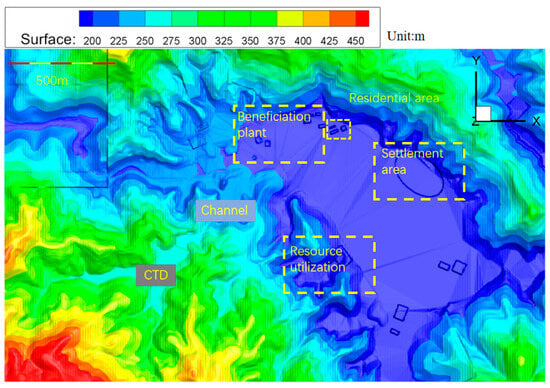 Under the condition of the maximum breach flow rate, the dam breach simulation was carried out, the satellite cloud map of the topography of the tailings pond and the distribution of the downstream residential area is shown in Figure 8, and the modeling preprocessing was carried out by using arcgis. The project area topography modeling is shown in Figure 9.