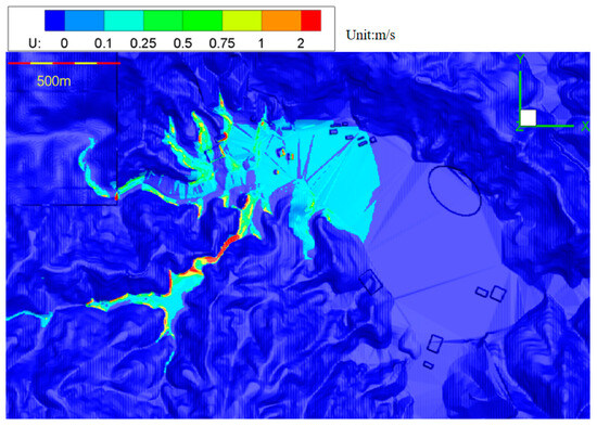 The evolution of the dam failure tailing sand flow can be seen. In the dam failure just started within 12 s of the tailing sand flow along the collapse of the caliber of the direction of movement into the first larger corner, due to the corner of the west side of the mountain height being lower, while the tailing sand flow velocity is larger, resulting in the formation of tailing sand flow diversion here due to the narrower ditch and the drop of about 90 m, the tailing sand flow velocity increased rapidly. At the flow distance of more than 350 m after the ditch, the topography gradually became gentle and open. After the flow distance exceeded 350 m, the topography gradually became smooth and open, and at this time, due to the faster speed of the tailings flow just washed out, it did not form an obvious accumulation of tailings flow directly to the pumping pool. Then, the arrival of the tailings flow rate is reduced, and there is an obvious accumulation in this location; the accumulation of tailings at this location impedes the subsequent transport of tailings, slowing down the flow rate and deposition of tailings, while the tailings head of the flow still continues to move downstream. There is the emergence of inundation areas 400 m from the tailings dam ditch entrance to the tailings dam’s 400 m ditch mouth at the center of the expansion to the four sides; a ditch inundation area to the west back to 3000 s from the beginning of the dam failure reaches a temporary balance, to stop continuing to the west and north expansion of tailings which continue to expand to the west.
