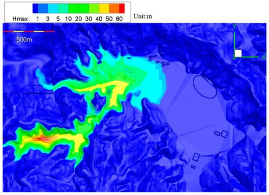 The numerical model was graphically modeled by using arcgis, the simulation operation was performed by using Massflow, and the simulation results were graphically analyzed numerically by using the tecplot post-processing tool, which can obtain the maximum flow depth distribution map and the maximum flow velocity distribution map of the downstream after the dam break, as shown in Figure 10 and Figure 11.