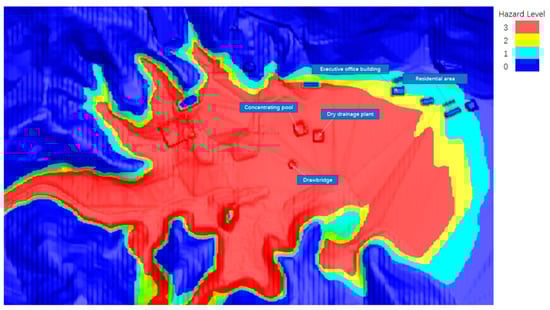 After the calculation and analysis, the disaster risk classification map after dam failure was obtained, as shown in Figure 12. From the analysis results in Figure 12, it can be seen that the main affected area is the downstream processing plant area, the impact area is distributed in the shape of a fan, and the settlement area in the downstream of the tailing pond in the mining area; the 700,000-ton resource utilization project is not affected, and the downstream residents are affected to a certain extent, which is a low-disaster area.