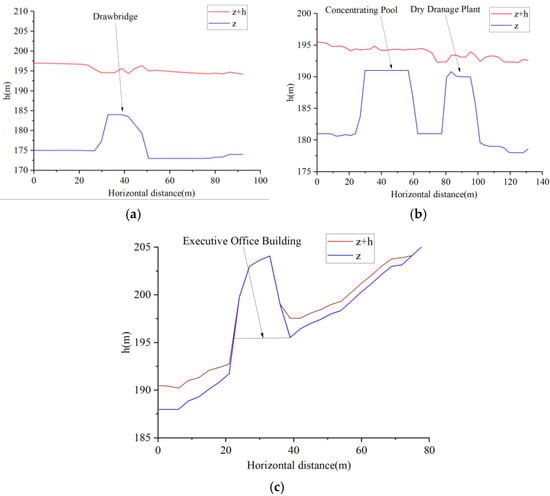 Maximum depth profiles at different locations. (a) Drawbridge, (b) concentrating pool and dry drainage plant, (c) executive office building.