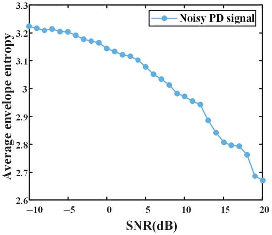 In order to verify the effectiveness of AEE as the fitness function, WGN with a step size of 1 dB and from −10 dB to 20 dB is superimposed, respectively, on the pure PD signal in