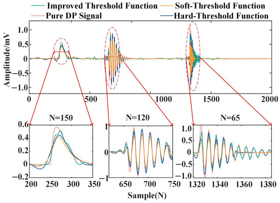 In addition, the modal parameter k of VMD in S_VMD only considers the thoroughness of decomposition and does not consider the accurate extraction of PD feature signals. IIE-MVMD deeply considers the setting of modal parameter k, but the penalty factor α still uses a fixed empirical value. In this paper, the MPA algorithm considering the MAEE is adopted, which can extract the characteristics of PD pulse signals to the greatest extent on the basis of adaptively obtaining k and α values. SVD-EWT adopts the noise reduction strategy of truncating and retaining PD. Though this strategy can maximally remove white noise, precisely locating PD start and end positions is challenging, and its noise reduction reliability needs further consideration. Finally, the improved wavelet threshold method proposed in this paper can eliminate white noise to the greatest extent on the basis of retaining the PD characteristic signal.