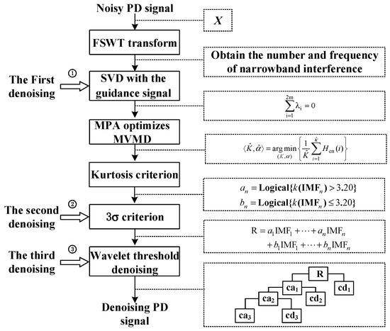 11] directly determines the decomposition layer for noise reduction through the spectral kurtosis diagram of the PD signal, thus avoiding the setting of the threshold coefficient, the parent wavelet and the number of decomposition layers. The results show that this method can remove white noise more effectively. In addition, the modal decomposition method has also received some attention in recent years due to its advantages of no preset basis function and strong adaptability. In [