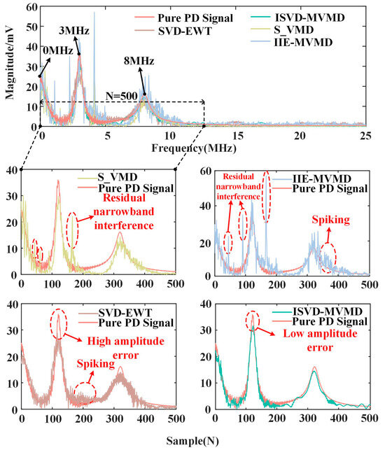 Figure 14, the useful information of the PD signal is mainly concentrated at 0 Hz, 3 MHz and 8 MHz. S_VMD and IIE-MVMD retain the waveform characteristics of the pure PD signal more completely, but the suppression effect on narrowband interference and WGN is general. SVD-EWT successfully suppresses narrowband interference by singular value decomposition, and the noise reduction effect on WGN is also good, but the PD signal has certain distortion and a large amplitude error. ISVD-MVMD successfully suppresses the periodic narrowband interference and WGN of the PD signal, and in the spectrum distribution, the distribution of the noise-reduced PD signal is basically the same as that of a pure PD signal.