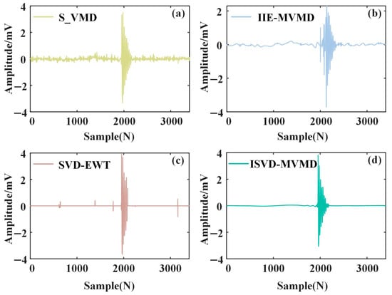Figure 13, the residual noise content of the signal denoised by S_VMD is large, and the noise reduction effect is not ideal. The noise reduction effect of IIE-MVMD is obviously improved, but there is still some spiking. Although SVD-EWT is used to segment and denoise the PD signal, and the removal effect of residual noise is significant, the starting position of the PD signal has shifted to a certain extent, which will affect the diagnosis and evaluation of defects. ISVD-MVMD can make the noise-reduced PD signal and the pure PD signal keep the waveform consistent as much as possible; the residual noise content is small, so the PD signal can eliminate narrowband interference and WGN as much as possible without distortion.