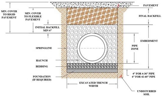 Open Excavation (also known as open cut, cut-and-cover, or trenching) is an excavation made in the open rather than a tunnel. The simplest method for installing a new pipe or replacing an old one entails digging a trench to the necessary depth, placing the pipe, filling the trench back in, and repairing the surface [1,2,3,13]. This open-cut trench method entails excavating and exposing the existing pipe for repair or replacement, followed by backfilling. As a widely used traditional method for underground infrastructure installation or replacement, the OCCM includes several steps: excavating the trench, securing the trench walls, preparing the pipe bedding, laying the pipe, embedding it, refilling the trench, compacting the soil, and restoring the surface [14] (Figure 1).