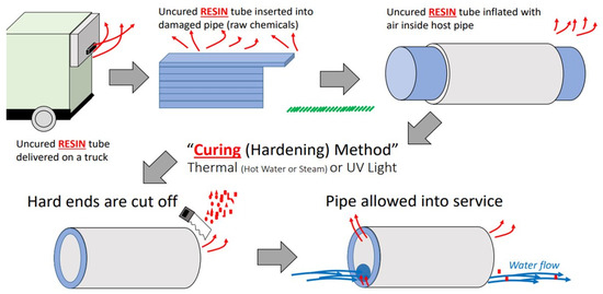 CIPPRT entails inserting a resin-saturated flexible fabric liner into the existing pipeline, inflating, or expanding it to fit the pipe’s interior, and hardening the resin through heat sources like hot water, steam, or UV light. This process creates a hard, anti-corrosive, and anti-seepage lining that adheres to the inner wall of the old pipe [4,18,23,33,34,35,36,37,38]. Figure 2 depicts the Cured-in-Place renewal process, showing the delivery and insertion of an uncured resin tube into a damaged pipe, inflation with air, curing through thermal or UV methods, trimming of ends, and, finally, the restoring of the pipe, ready for service.
