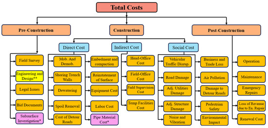 This framework integrates diverse parameters to calculate a comprehensive life-cycle cost. It accounts for quantifiable factors, including project specifics (e.g., length and diameter of the culvert, material properties), environmental considerations (e.g., emissions, energy use, and material sources), and socio-economic factors (e.g., traffic control, noise, and community impacts). Advanced computational tools like Minitab (https://www.minitab.com (accessed 25 December 2024)) and Microsoft Excel (https://www.microsoft.com/excel (accessed 25 December 2024)) software are employed for construction cost analysis. SimaPro (https://simapro.com/ (accessed 25 December 2024)) software is employed to quantify environmental impacts based on metrics such as global warming potential, smog generation, and resource depletion [18,33]. LCCA can be used as an important and effective decision-making tool to determine the cost of rehabilitation alternatives based on each alternative’s full life-cycle (service life). A survey of the largest municipalities in the U.S. indicated that 40% of municipalities use LCCA and that some have been using it for over 20 years [63]. The reasons why 60% of municipalities have not used LCC analysis include the lack of formal guidelines and the difficulty of estimating future expenses and income [64]. The life-cycle cost of the project, from its design to the decommissioning of the utility, includes the following categories [18,20,29,65] (Figure 3):