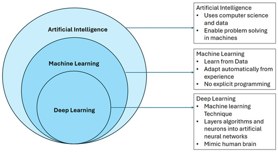 Illustration of the hierarchical relationships between artificial intelligence, machine learning, and deep learning.