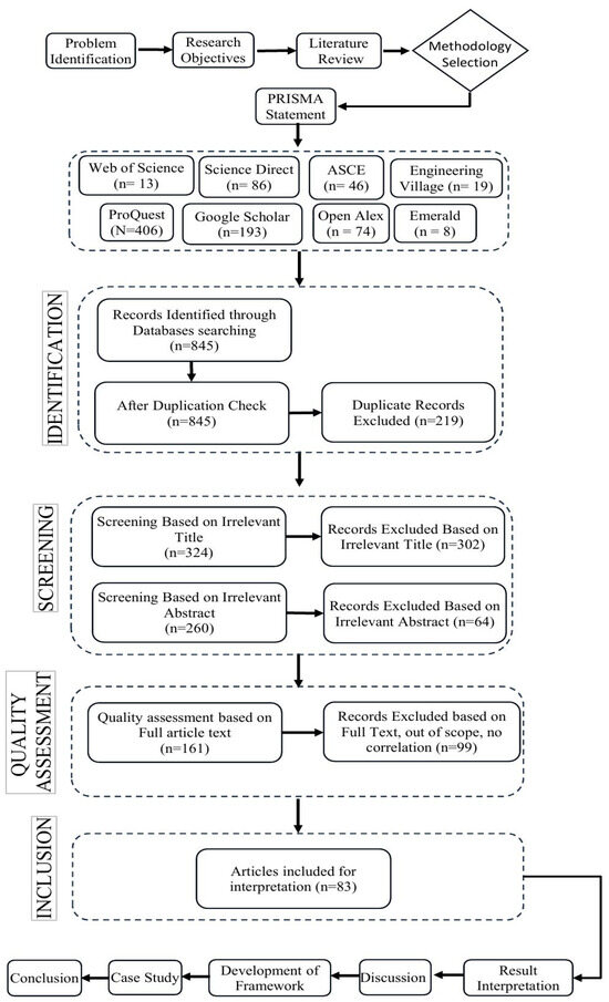This stage involved defining the research questions and selecting appropriate databases for the literature review. The primary databases included Google Scholar, ScienceDirect, OpenAlex, Engineering Village, Emerald, ProQuest, ASCE, and Web of Science. Zotero was used to organize references due to its advanced features. The review was limited to studies published between 1990 and 2024. The study defined the research problem and set clear objectives. An extensive review of the literature was undertaken, with its methodology guided by the PRISMA framework [11,32,59,69,70,71,72,73]. PRISMA was chosen for its systematic approach to disseminating and screening collected documents, facilitating a thorough review. The PRISMA methodology used in this review comprises four steps: